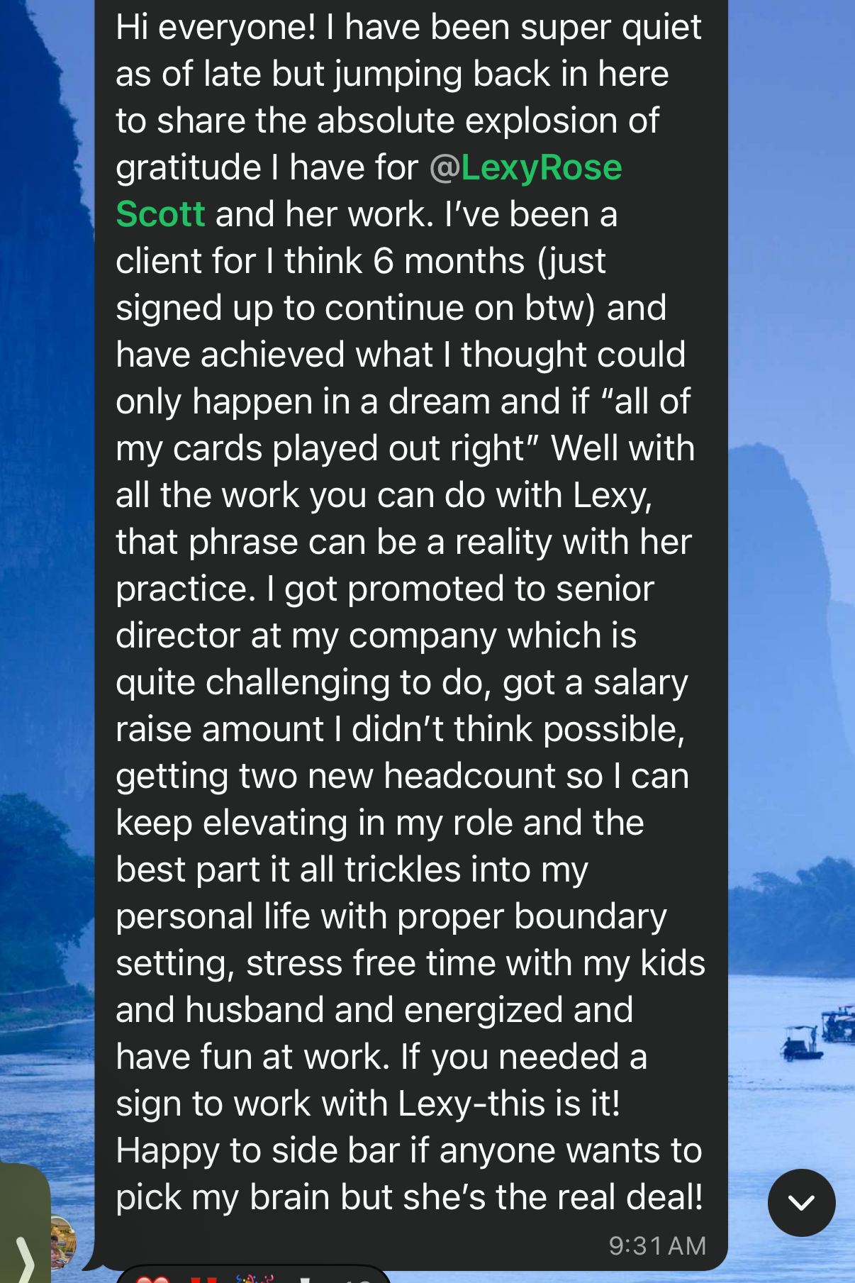 “I’ve achieved what I thought could only happen in a dream. I got promoted to senior director, received a salary raise I didn’t think was possible, and now have the support to keep elevating in my role. The best part is it’s all trickled into my personal life with proper boundaries, stress-free time with my family, and actually having fun at work. She’s the real deal.”